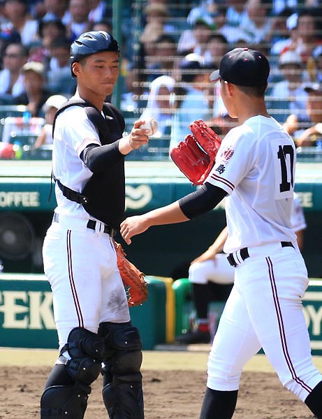 仙台育英戦に先発して六回途中まで投げた広陵の山本(右)と励ます捕手の中村(C)日刊ゲンダイ