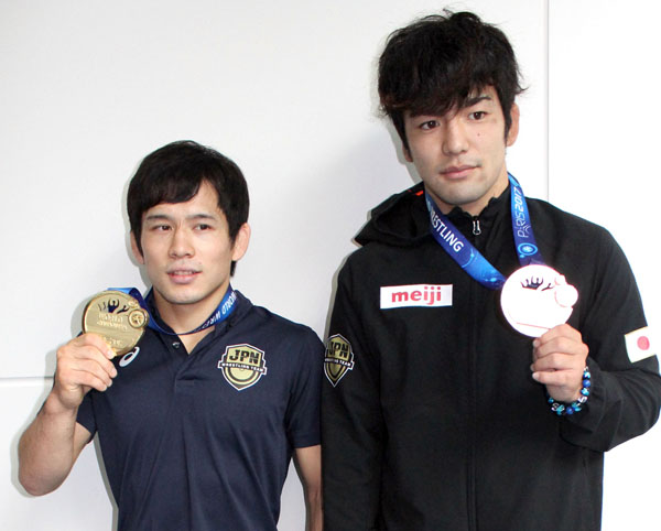 フリースタイル57キロ級金メダル高橋侑希(左)と70キロ級銅メダル藤波勇飛(C)日刊ゲンダイ
