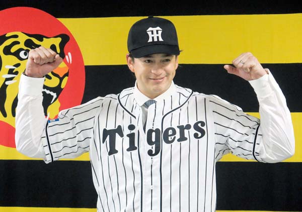 阪神入りしたメンドーサ(C)共同通信社