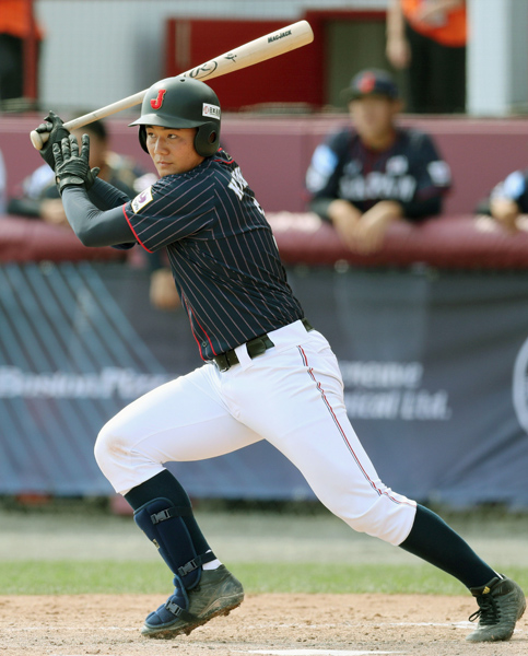 オランダ戦の五回、二塁打を放つ清宮(C)共同通信社