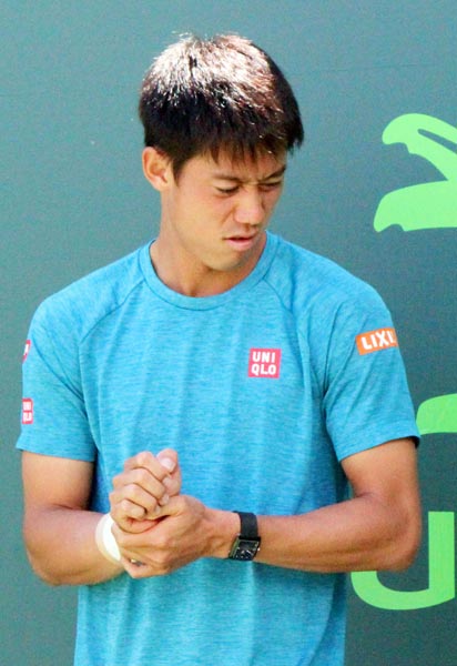 3月のマイアミ・オープンで右手首を気にする錦織(C)共同通信社