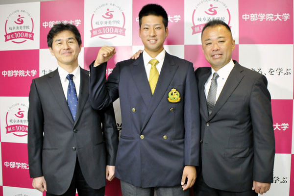 右から原監督、平岡、鵜飼部長(中部学院大提供)