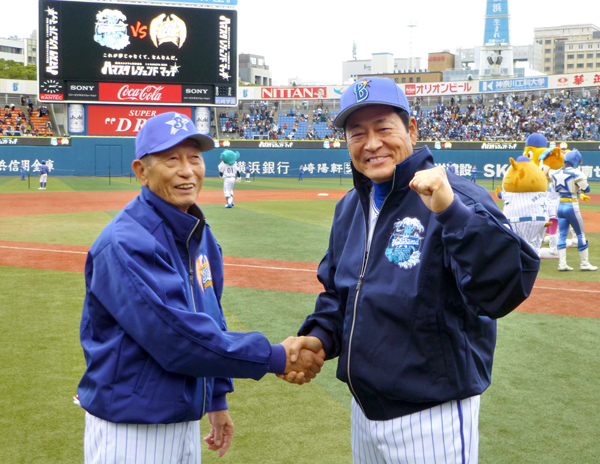 レジェンドマッチで中畑監督(右)と握手(C)共同通信社