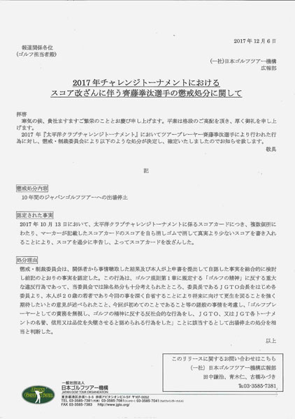 斉藤拳汰プロは10年間の出場停止(提供写真)