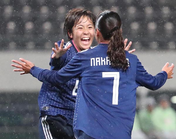 3点目を決めて喜ぶFW岩渕(背中は2点目を決めたMF中島)/(C)日刊ゲンダイ