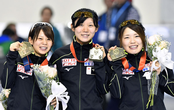 表彰台でニッコリ(左から高木菜、高木美、佐藤)/(C)共同通信社
