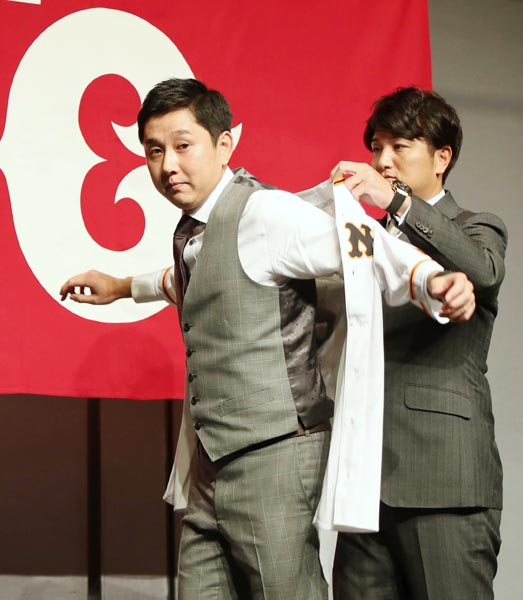 ユニフォームに腕を通す野上(右は高橋監督)/(C)日刊ゲンダイ