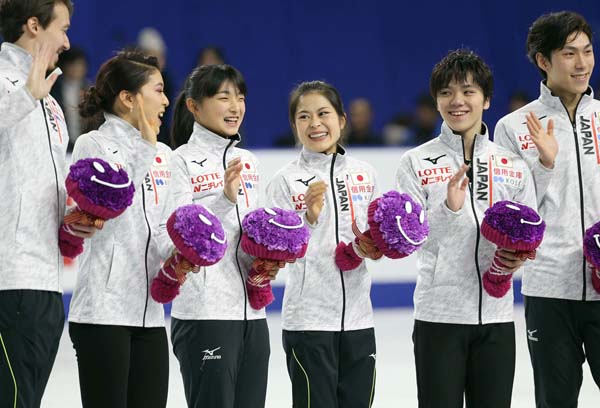 左から平昌代表に決まったリード・村元組(アイスダンス)、坂本花織、宮原知子、宇野昌磨、田中刑事(C)日刊ゲンダイ