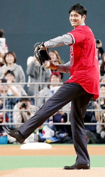 ファンを前にしたセレモニーで投球する大谷(C)共同通信社