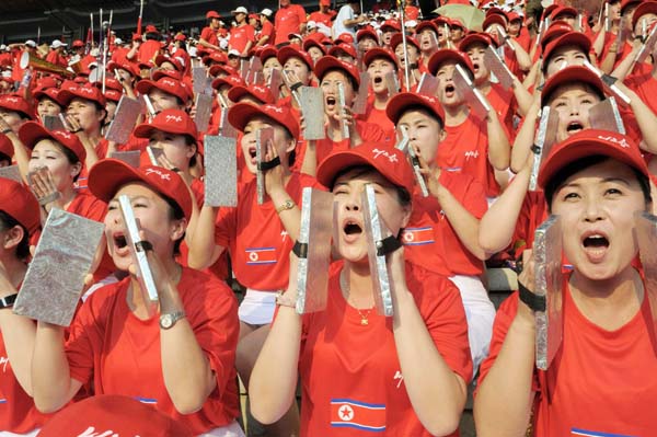 サッカーW杯アジア2次予選で声援を送る北朝鮮の女性応援団(C)共同通信社