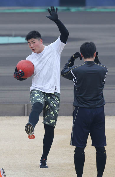 ラグビーのキックの真似をする清宮(C)日刊ゲンダイ