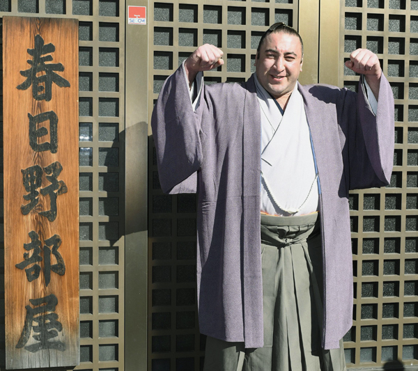 千秋楽から一夜明け部屋の前でガッツポーズ(C)共同通信社