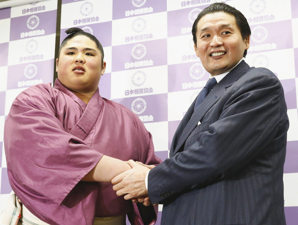新十両に昇進した貴公俊の記者会見に出席した貴乃花親方(C)共同通信社