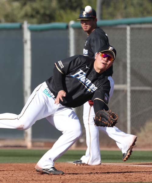 ファーストでノックを受ける清宮。後ろは中田翔(C)日刊ゲンダイ/石井俊平