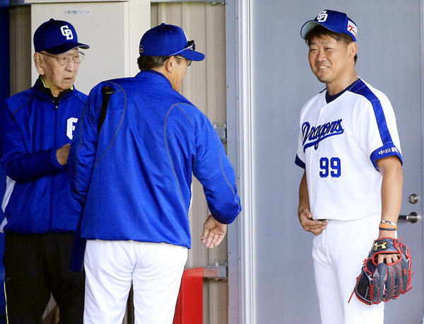 松坂はキャンプ初の投球で森監督と笑顔で会話(左は杉下茂臨時コーチ)/(C)日刊ゲンダイ