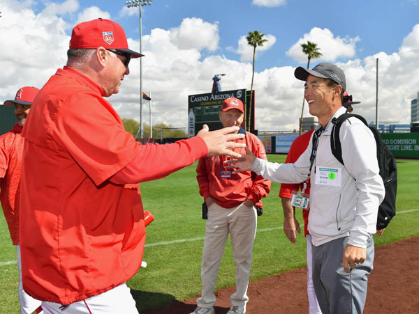 キャンプ地を訪問しエ軍ソーシア監督(左)と握手を交わす長谷川氏(C)共同通信社
