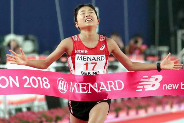 日本勢トップの3位でゴールする関根花観(C)共同通信社
