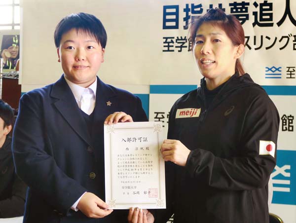 東京五輪でメダルを期待されて入部する西(左)と副学長の吉田/(C)共同通信社