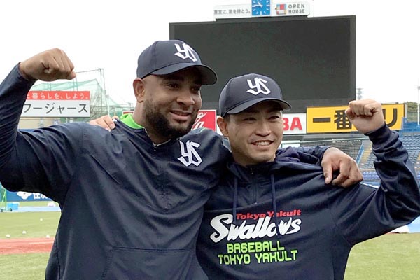 ヤクルト「オープンハウス」とスポンサー締結発表会見にバレと臨む(C)日刊ゲンダイ
