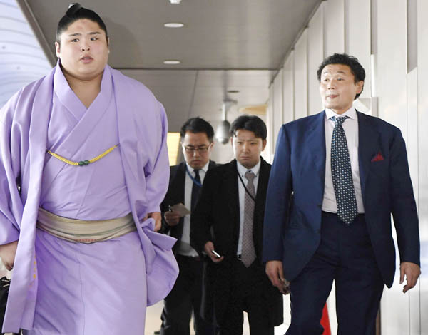 事情聴取を終えた貴乃花親方と貴公俊(C)共同通信社