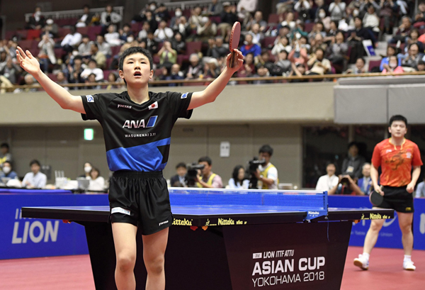 卓球アジア杯で世界ランク1位の樊振東(奥)に勝利した張本(C)共同通信社