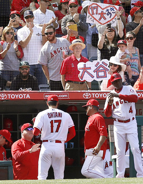 8日のアスレチックス戦で7回1安打無失点で抑え、ソーシア監督に迎えられる大谷(C)共同通信社