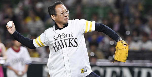 10日、ソフトバンクの始球式に登場した岡田氏(C)共同通信社