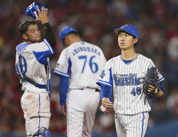2回途中7失点で降板する DeNAの京山(右)/(C)共同通信社