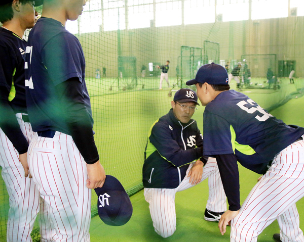 春キャンプで若手を教える河田コーチ(右から2番目)/(C)日刊ゲンダイ