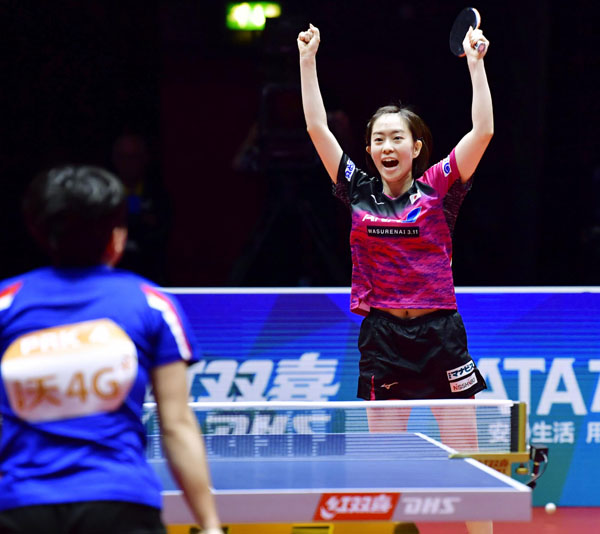 第2試合でキム・ソンイに競り勝ち跳び上がって喜ぶ石川佳純(C)共同通信社
