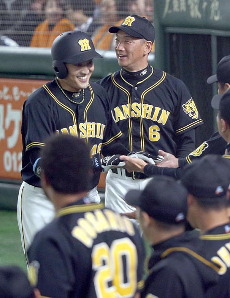 本塁打の秋山拓巳(左)を笑顔で迎える金本監督(C)日刊ゲンダイ