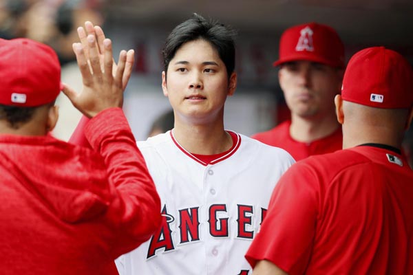レイズ戦で好投し、ナイスとタッチを交わす大谷(C)共同通信社
