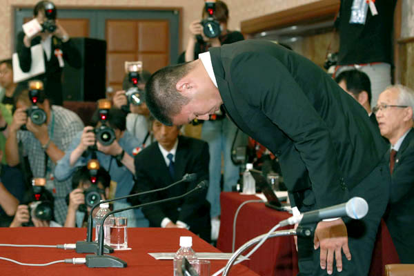 記者会見で頭を下げる日大の宮川選手(C)日刊ゲンダイ