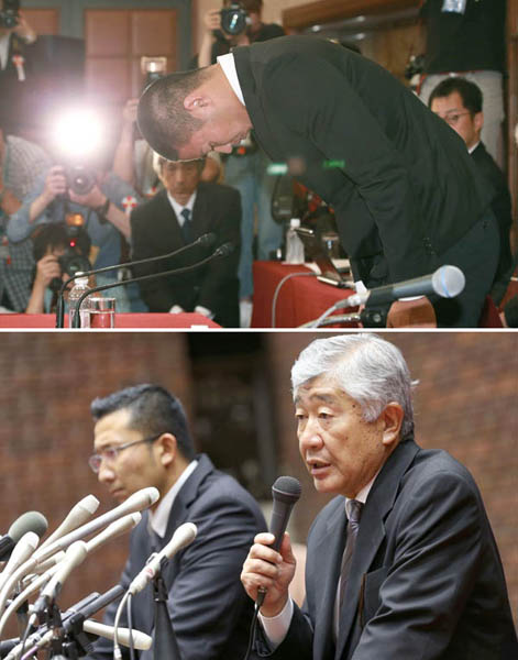 対照的だった宮川選手の謝罪会見(上)と日大の内田監督会見(C)日刊ゲンダイ