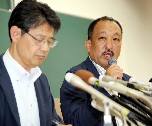 会見をする鳥内監督(右)と小野ディレクター/(C)日刊ゲンダイ