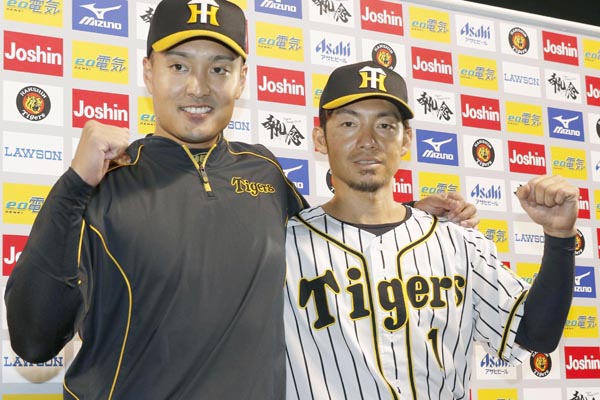 お立ち台の鳥谷(右)は5勝目の秋山と肩を組んだ(C)共同通信社