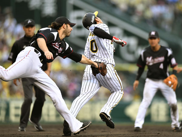 阪神・中谷は盗塁を試みるもタッチアウト(C)共同通信社