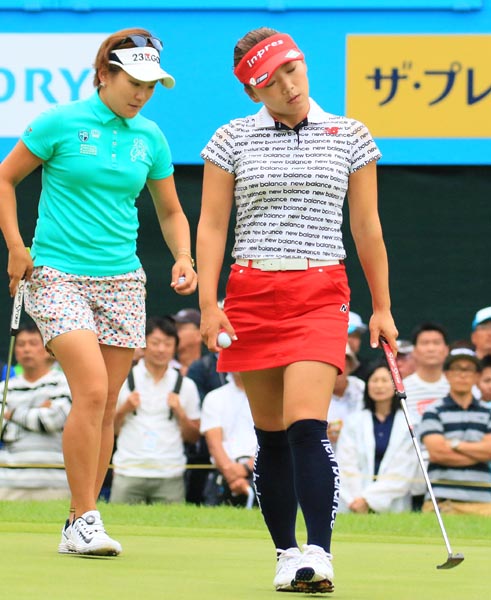 パットが決まらず首をひねる有村(右)/(C)日刊ゲンダイ
