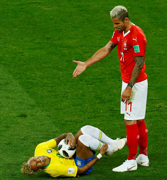 初戦のスイス戦で悶絶するネイマール(C)ロイター