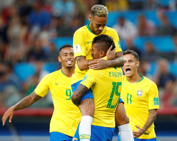 先制点を挙げたパウリーニョに飛びつくネイマール(C)ロイター