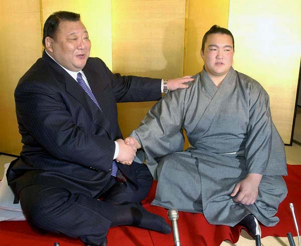 04年、十両昇進時の稀勢の里と先代親方(C)共同通信社