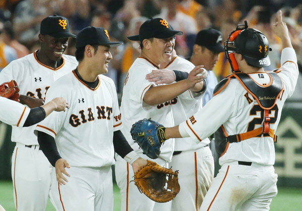 ウイニングボールを手に喜ぶ山口俊(中央)(C)日刊ゲンダイ