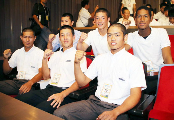 前列右から根尾(大阪桐蔭)、小園(報徳学園)、藤原(大阪桐蔭)、後列右から万波(横浜)、吉田(金足農)、大谷(中央学院)(C)日刊ゲンダイ