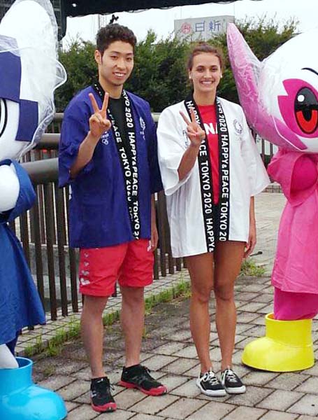 法被姿の萩野公介 カナダの美女スイマーと並んでVサイン