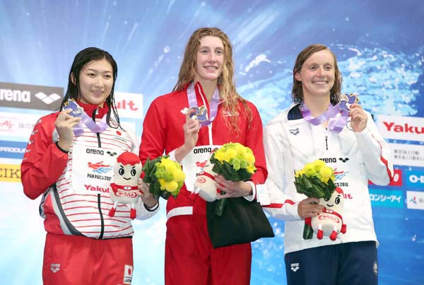 日本記録更新で、自身初となる国際大会のメダルを手にした池江瑠花子。テイラー・ラック(中)、ケイティ・レデッキー(右)と(C)日刊ゲンダイ