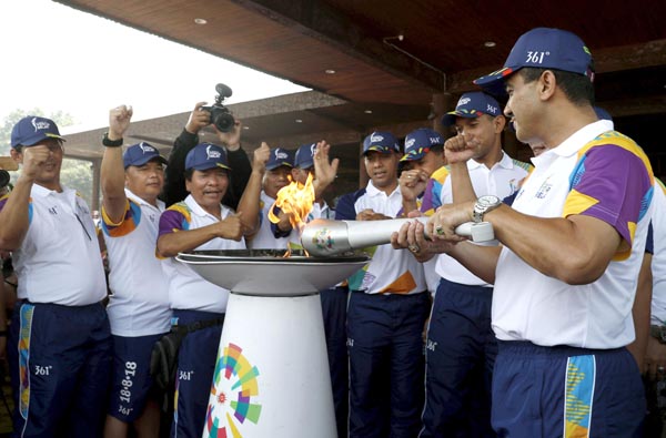 開幕を前にジャカルタに到着した聖火(C)共同通信社