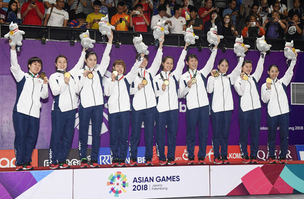 表彰式で金メダルを手に笑顔の日本チーム(C)共同通信社