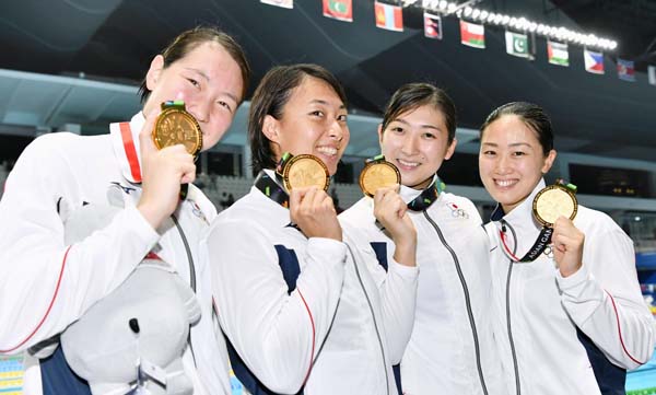 5個目の金メダルを手にした池江(右から2人目)(C)共同通信社