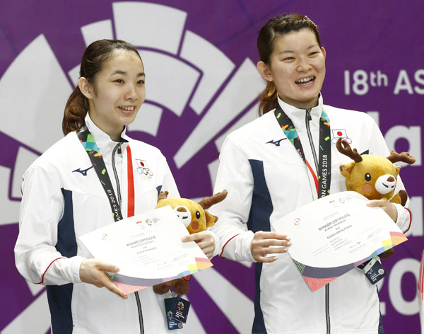 表彰台で笑顔を見せるタカマツペア(C)共同通信社