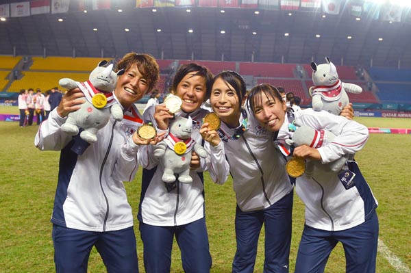 金メダルを掲げるなでしこたち(左からDF有吉、FW岩渕、DF鮫島、MF中島)/(撮影=早草紀子)